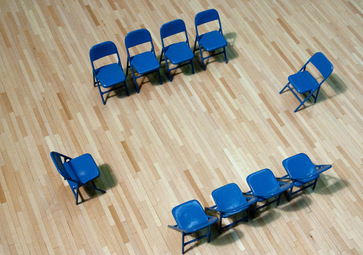 Meeting IV brass, cast bronze, laminated wood, 2013