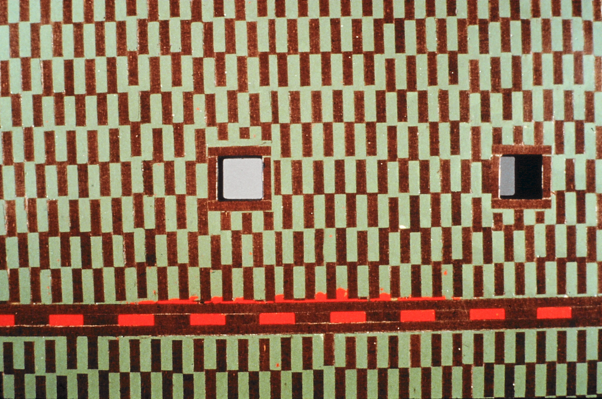 Pediment 3 laminated pressboard on wood with colored inlays, 24 x 72 x 3.5 in., 1990